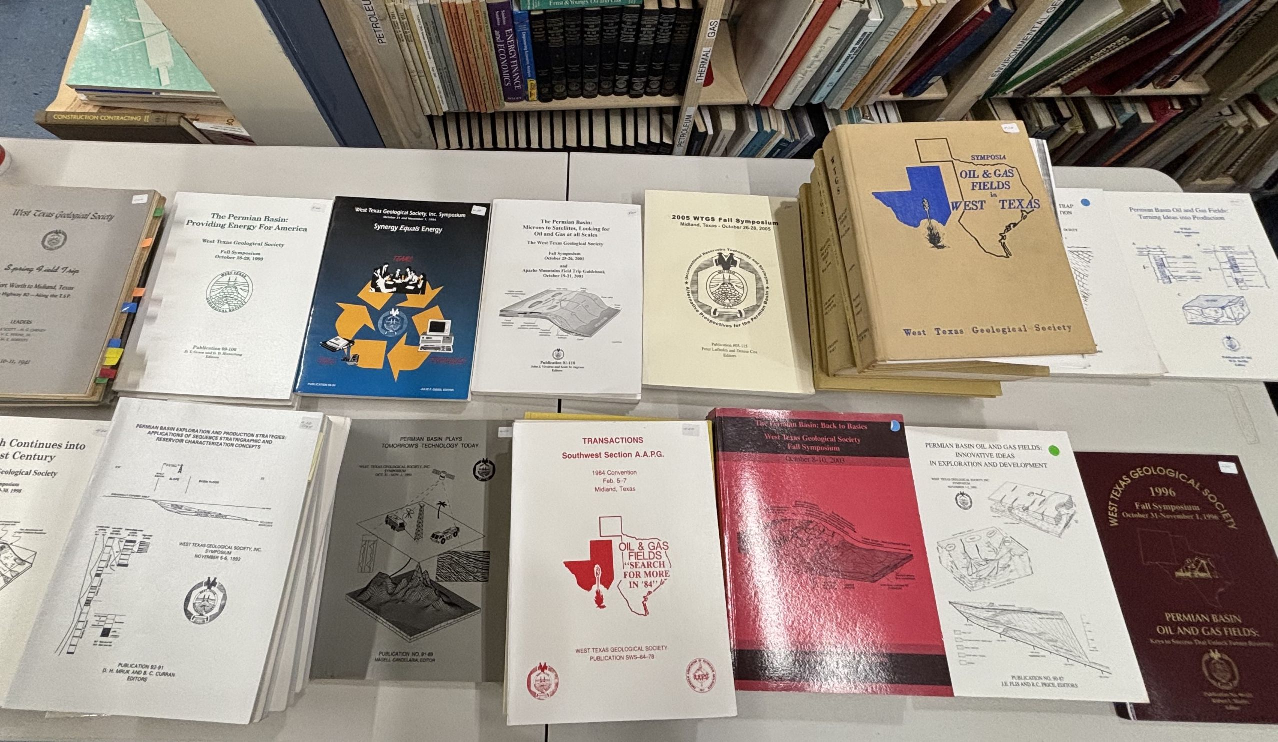 This library's oil and gas section is overflowing with books! They have eight full-size bookshelves devoted to oil and gas, WTGS publications dating back to the 40s and 50s, and publications from many other geological societies.